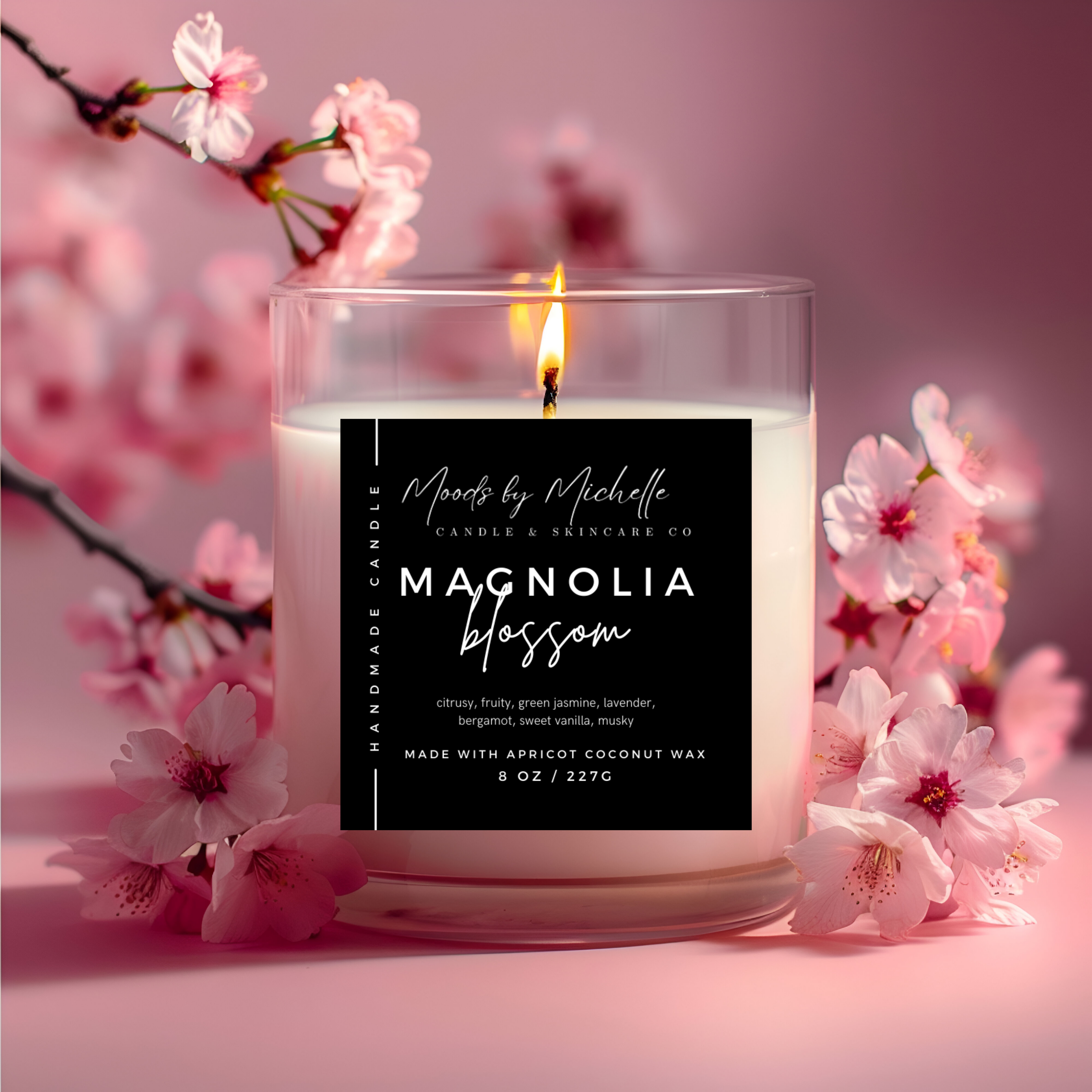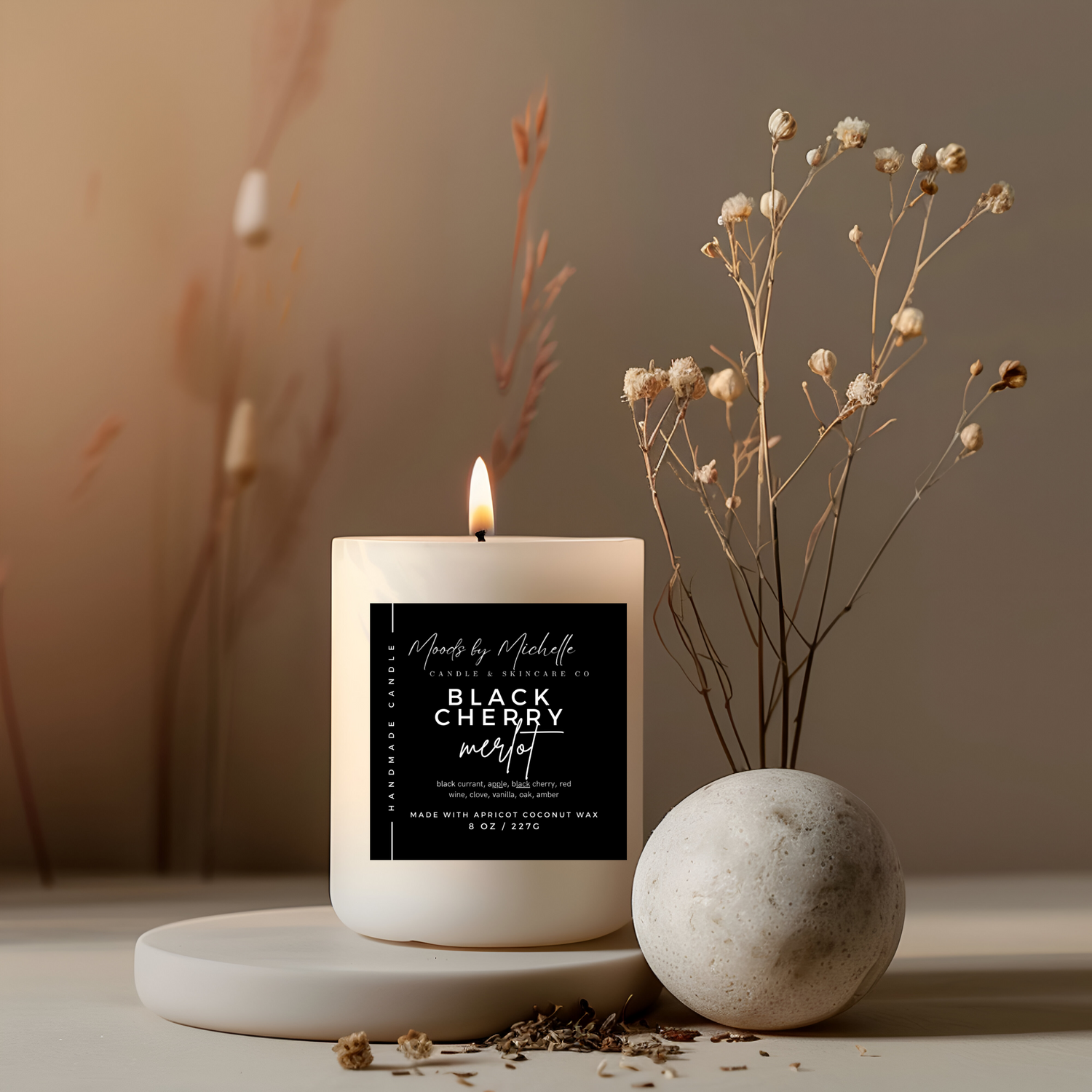 We use 100% Coconut Apricot Wax in all our candles. Our candles burn slower and longer, giving customers 57 hours of burn time. Coconut wax also burns cleaners and produces less soot, helping to keep your surfaces clean.